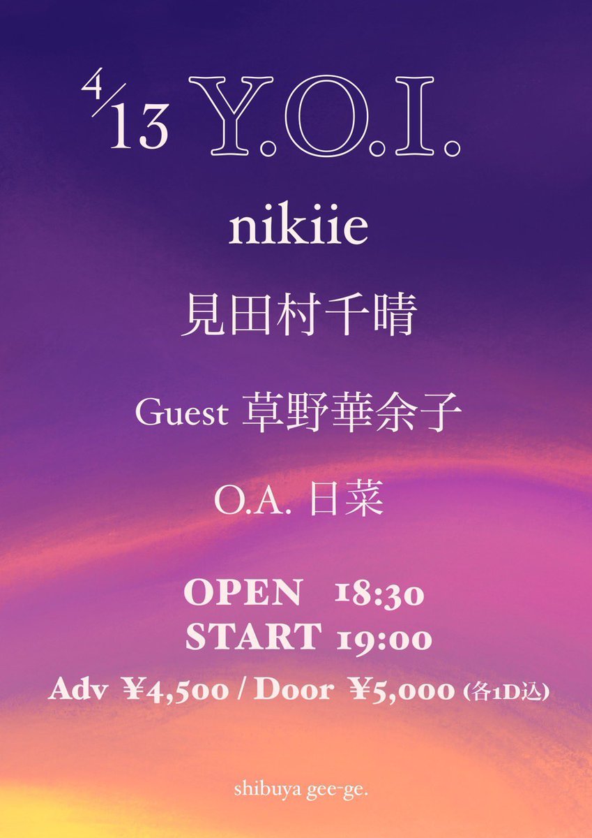 見田村千晴の寄合がTwitterを更新しました 2年以上前 Twitterへ 【本日】渋谷ジージでライブ! お待ちしてます。 「Y.O.I.」 nikiie/見田村千晴/Guest草野華余子/O.A.日菜 OPEN 18:30 START 19:00 前売¥4,500 /当日¥5,000(1D込) https://t.co/aonkn1CibW 1 0 0