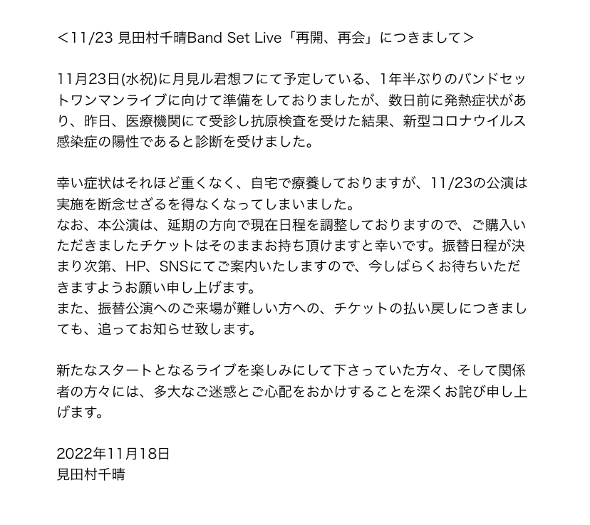 <11/23 見田村千晴Band Set Live「再開、再会」につきまして>